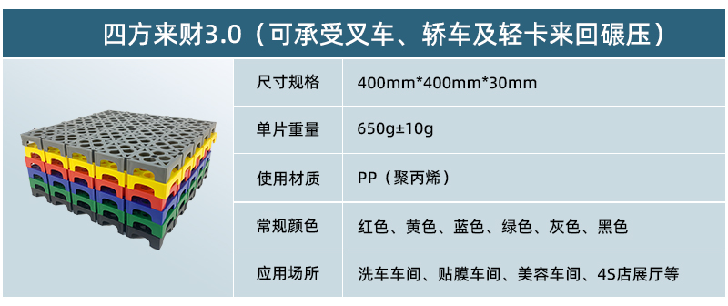 1. 分為3.4.5.厚度,解決不同厚度,統(tǒng)一紋路的問題 2. 啞光平紋設(shè)計,防滑,美觀,易清潔 3. 選用高級原料,加入其他輔料,顏色亮麗,無異味,無污染 4. 顏色為紅黃藍綠黑灰六色,滿足客戶用色需求,搭配屬于自己的風(fēng)格 5. 通扣鎖扣設(shè)計,容易鋪設(shè)且容易拆卸打理 6. 加強支撐,不容易出現(xiàn)壓壞壓斷現(xiàn)象,滿足大多數(shù)車輛施工的要求 7. 使用年限長,五年超長質(zhì)保,使用無后顧之憂 8. 十字支撐,保證承載最大化的同時,且易排泥排水