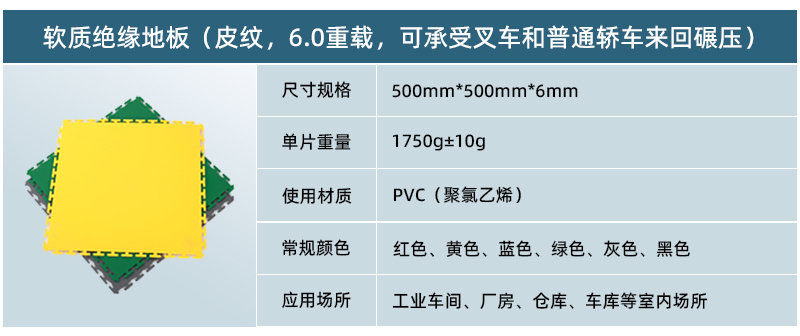 5、高承載,更防滑: 軟質(zhì)絕緣地板為實心結(jié)構(gòu),只要地面承重沒有問題,其承載能力能夠達到每平米10噸以上。地板表面在生產(chǎn)過程中帶有凸起的紋路,讓車間地面更為防滑。