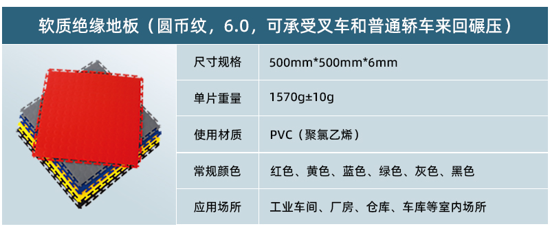 5、高承載,更防滑: 軟質絕緣地板為實心結構,只要地面承重沒有問題,其承載能力能夠達到每平米10噸以上。地板表面在生產過程中帶有凸起的紋路,讓車間地面更為防滑。